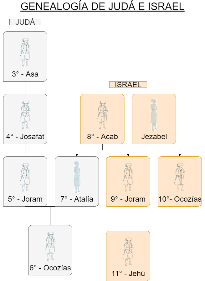 Al morir Joram, Ocozías, su hijo, reina por un sólo año y hace lo malo, "pues su madre le aconsejaba a que actuase impíamente" (2 Crónicas 22:3) y muere por Jehú junto con su tío, Joram de Israel. Pero esto venía de Dios, para que fuese destruido” (2 Crónicas 22:7). Así complementamos la historia que faltaba de Judá.