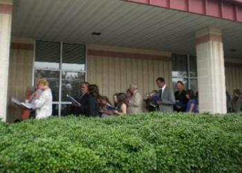 Our custodian had arrived, and our set-up crew was eagerly awaiting the “OK” to enter the building and begin setting up our meeting room for services. She came to the door instead to tell us, “We have no air, no lights, only emergency lights inside,” due to a thunderstorm Friday night. We were more than willing to meet in the building without air conditioning (having already done so many times before) and with only emergency lights, which were adequate. However, after consultations between church and school contacts it was approved for us instead to meet outside the building. More members were arriving, and things can quickly get done when lots of “worker ants” get together, committed to having Sabbath services! Each one went into our meeting hall to bring folding chairs, the podium, tables, flowers, song books, etc., and set up rows, two chairs wide, from one end of the covered walkway to the school entrance for about 50 brethren. After a prayer of thanks for having our own meeting place, song service began with no piano, but with our a capella experienced deacon, Larry Powers, leading our singing. It was on tune and heartily sung!
